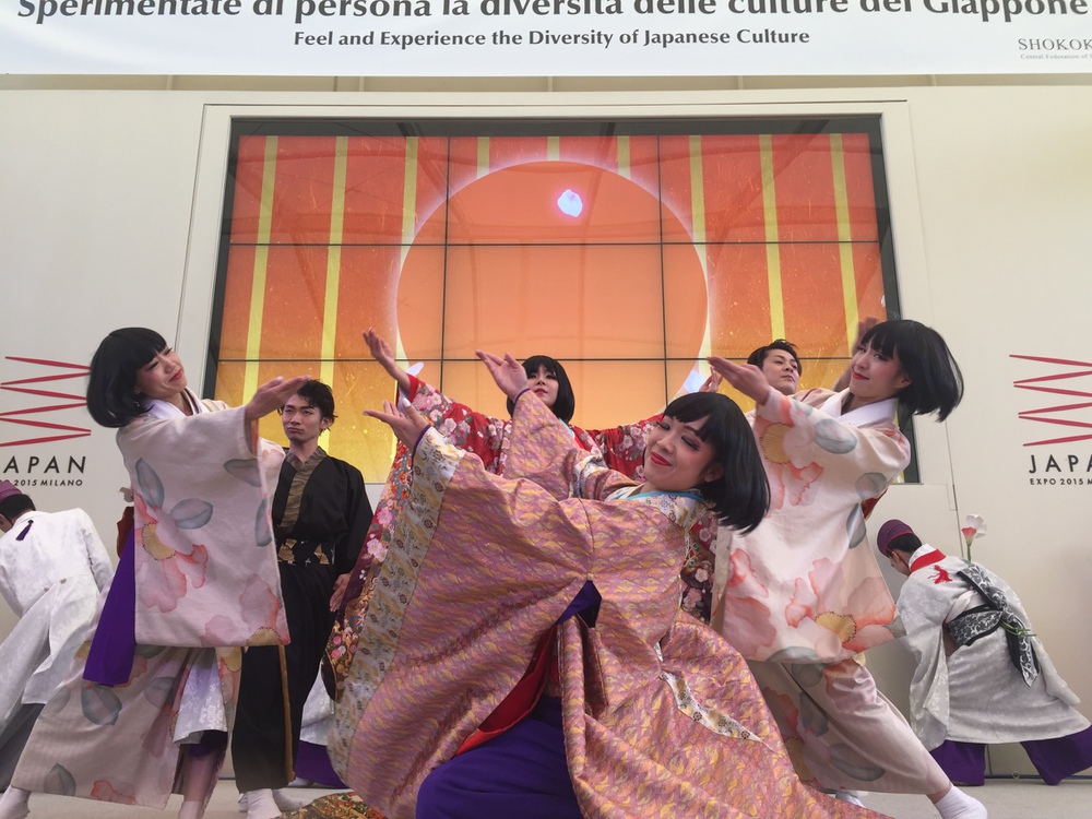 ミラノ万博・日本館のイベントに、進化する日本文化の多様性を表現する団体として参加。よさこいと花魁道中、映像を織り交ぜた舞台を披露しました。三味線やフリースタイル・フットボーラーとコラボし、その時点での日本館来場者数の最高 記録を更新するほど人気を博しました。 出演者数:12名