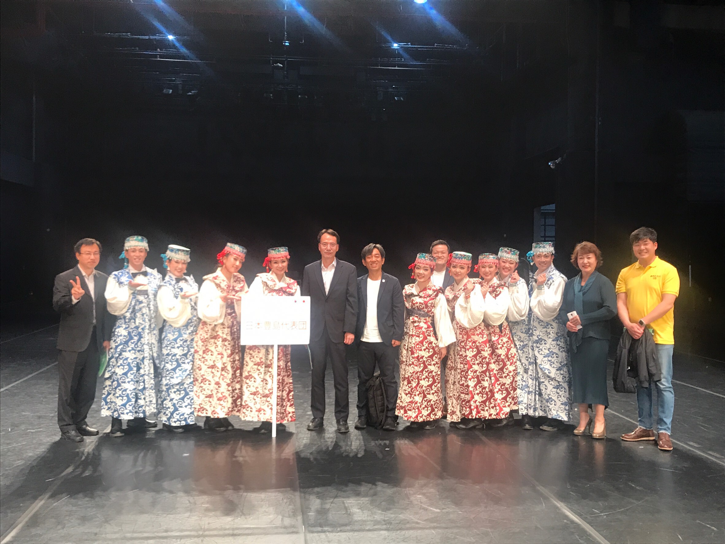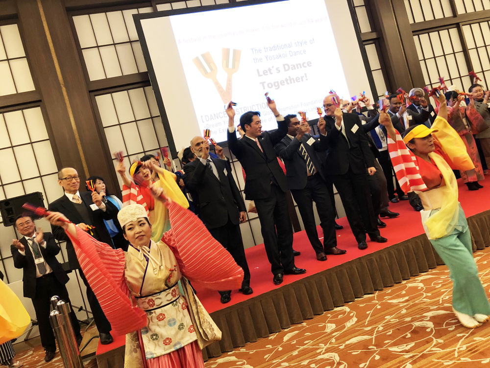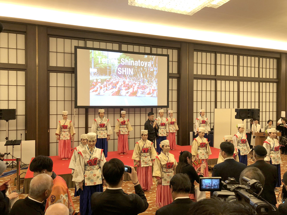 河野外務大臣と尾崎高知県知事(いずれも当時)による、高知県を国際的にアピールする共同レセプション。各国大使館/領事館やメディアから数百名のお客様を迎えた舞台での演舞と、尾崎知事をはじめ各国大使と踊った鳴子踊り体験は大いに盛り上がりました。出演者数:17名(日本語&英語MC対応)